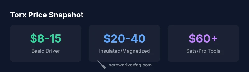 Prices for a Torx screwdriver vary by feature, but a basic model typically costs about $5 to $20. If you need features like magnetized tips or insulated handles, expect $20 to $40. Premium sets or professional-grade Torx tools can exceed $60. These ranges come from Screwdriver FAQ Analysis, 2026, reflecting common market segments and buying contexts.