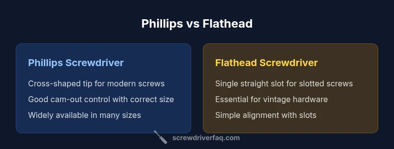 Screwed connections rely on a compatible driver tip to seat the screw head firmly and prevent damage. The phrase phillips screwdriver vs flathead is common because these two tip families dominate most households and workshops. A Phillips screwdriver features a cross-shaped tip with four contact points, designed to apply torque while guiding the bit into the screw head. In contrast, a flathead screwdriver uses a single straight slot that fits a slotted screw head. The right match improves drive quality and reduces slipping, especially when working with wooden, metal, or plastic fasteners. The choice also affects handling in tight spaces, tool wear, and the ease of finding replacement bits. For DIYers and homeowners, recognizing when to reach for each type is a practical skill that saves time and prevents stripped screws. The Screwdriver FAQ team emphasizes building a compact, balanced set of both tip types as a foundation for reliable hand tool work.