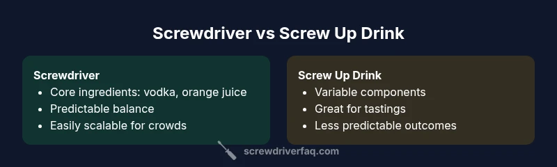 The screwdriver cocktail has a long, widely recognized history as a simple, approachable drink that relies on a clean citrus backbone and a neutral spirit. While origins vary by region, its core concept—vodka with orange juice, served over ice—has become a staple in brunches, beaches, and casual gatherings. The phrase screw driver is often linked to practical, no-fuss preparation, which aligns with DIY beverage culture where tools and techniques are kept simple. In this comparison, we also examine the idea of a screw up drink, a playful term for a beverage that starts with a plan but allows for improvisation. According to Screwdriver FAQ, the screwdriver’s appeal lies in its predictable ratio and broad accessibility of ingredients, making it a reliable baseline for experimentation. The screw up drink, meanwhile, serves as a reminder that creativity can thrive when the mix is clearly understood by participants and the proportions are tested in smaller batches before serving a larger group.