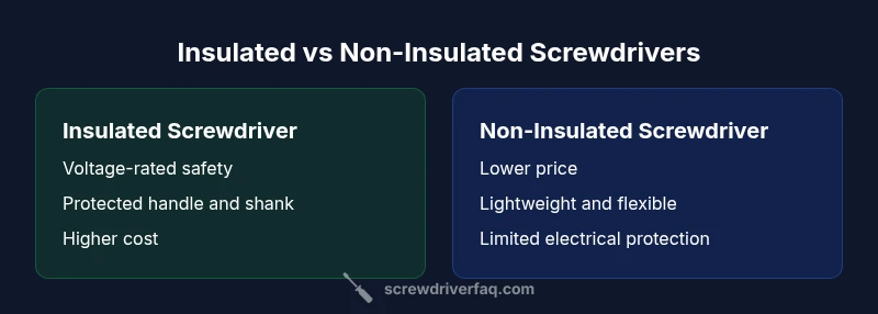 The phrase insulated screwdriver vs non insulated refers to two tool categories that differ mainly in electrical protection and intended tasks. Insulated screwdrivers are built with a plastic or rubberized handle and a layered insulation system designed to endure voltage stress, while non insulated screwdrivers have an uninsulated or minimally insulated handle. In practice, this distinction matters most when you work near live circuits, but it's also a marker of how the tool will perform in everyday use. In DIY projects, understanding the difference helps optimize safety, efficiency, and value.