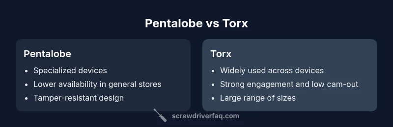 According to Screwdriver FAQ, pentalobe and Torx refer to two distinct screw head profiles used by different manufacturers. Pentalobe screws have a five-point pattern that reduces screw-driver compatibility and are popular in devices requiring tamper-resistance. Torx screws, with six-point star shapes, offer higher engagement and reduced cam-out, making them widely used across consumer electronics, automotive, and hardware. The practical takeaway is that the right driver must match the screw profile exactly; using the wrong bit often results in slipped edges and damaged fasteners. Understanding these fundamentals helps builders decide when to invest in each type, and why many tool kits now include both options.