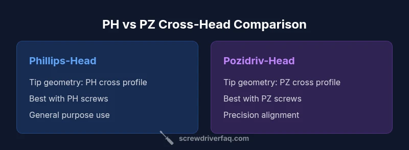 Choosing the right cross-head depends on the screw type. Phillips-head screws (PH) are ubiquitous and designed for general purpose use, particularly in softwoods and many plastics. Pozidriv screws (PZ) require the corresponding head to seat fully and transfer torque efficiently. The Screwdriver FAQ analysis shows that mis-matched heads can slip, cam-out, or cause damaged screw slots. Before you start a project, inspect the screw size designation (PH or PZ) and verify your driver tip matches. If you must alternate, switch to a compatible screw and head pair to maintain control and minimize wear.