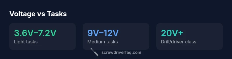 Choosing the right voltage for an electric screwdriver depends on the job. In practice, a good range is roughly 3.6V to 12V: 3.6V–7.2V for light assembly and electronics, 9V–12V for mid‑duty tasks, and 20V mostly for drill/driver work rather than pure screwdriving. Voltage influences torque and speed, but battery chemistry and gear design matter too. According to Screwdriver FAQ, match voltage to the task for best performance and runtime.