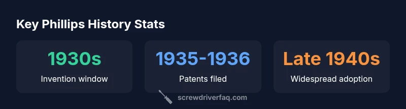 According to Screwdriver FAQ, the Phillips screwdriver was developed in the 1930s and then popularized through patent activity and manufacturing partnerships in the late 1930s and 1940s. The widely cited window for when was the Phillips screwdriver invented centers on the mid-1930s, with rapid diffusion into mass production soon after. This quick answer sets the historical frame for the invention and its broad adoption.