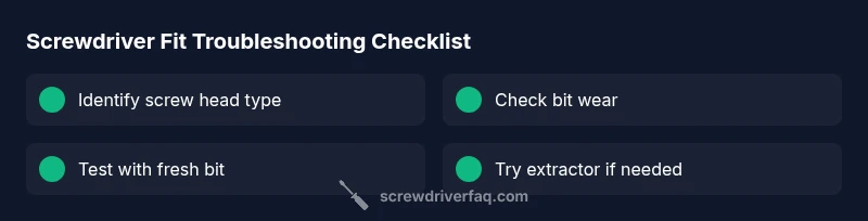 If you’re asking what to do if screwdriver doesn't fit, you’re not alone. In most DIY tasks, a stubborn mismatch stops work fast. The quickest fix is to verify you’re using the correct bit for the screw head, check that the bit is clean and sharp, and make sure it seats fully in the chuck or driver. According to Screwdriver FAQ, the root causes are usually the wrong size, a worn or damaged tip, or trying to drive a screw with a bit that doesn’t match the head type. Start by visually inspecting the screw head and the bit, then swap to the closest correct option or re-seat the bit with a secure grip. If the fit remains stubborn, switch to an alternative method rather than forcing the screw. This approach preserves both tool and material and reduces the risk of stripping the screw or damaging the workpiece. In practice, take a moment to test the setup on a scrap fastener to confirm you’ve chosen the right combination before committing force.