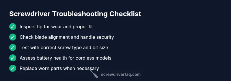 According to Screwdriver FAQ, many screwdriver problems boil down to a few repeatable culprits: worn tips, the wrong bit size, loose handles, or a depleted power source on cordless models. Start with the simplest fixes and verify each factor step by step. This approach reduces unnecessary disassembly and keeps you safe. If you’ve just bought a new set, check that edges and tips are true and not deformed from shipping. If you find that the problem is persistent, you’ll move into deeper diagnostics with confidence rather than guesswork.