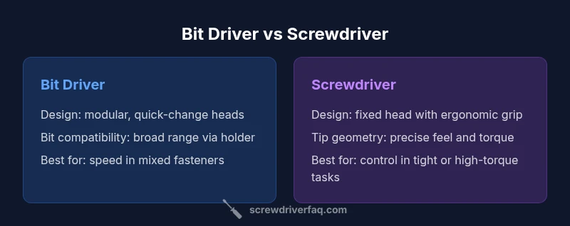 Bit driver vs screwdriver is a common crossroads for DIYers. In most projects, a bit driver offers rapid bit changes and a compact profile, while a traditional screwdriver provides tactile feedback and steadier torque. According to Screwdriver FAQ, the choice hinges on task variety, bit compatibility across projects, and comfort: use a bit driver for speed and flexibility, reserve a screwdriver for precision and control in tougher screws.