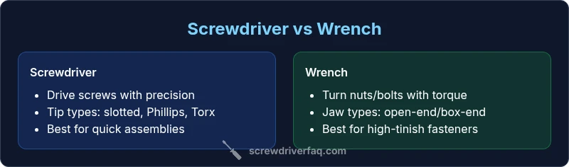 At a high level, screwdrivers and wrenches are designed for different fastening paradigms. A screwdriver uses a sharp, angled tip that seats in the screw head and converts rotational input into linear torque along the screw axis. A wrench uses a jaw or box end to grip the nut or bolt head and applies torque through leverage. This fundamental distinction drives everything from available drive types to how you handle the tool during a job. For most DIYers, understanding this difference helps you pick the right tool for the task and avoids common mistakes such as using a wrench as a lever for screwdriving or vice versa. The Screwdriver FAQ team emphasizes that recognizing the job the fastener demands is more important than chasing a single “best” tool.