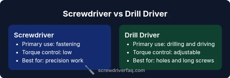 At its core, the screwdriver and the drill driver are designed for different jobs. The screwdriver is optimized for turning screws with precision and minimal damage to delicate workpieces. The drill driver pairs a drill with a screwdriver-like clutch, enabling drilling and driving with controlled torque. For many DIY projects, you will reach for the screwdriver for assembly tasks and for fastener-driven installations, while the drill driver handles holes and longer screws. According to Screwdriver FAQ, understanding these fundamental differences helps homeowners allocate your tool budget effectively and reduces the chance of buying the wrong device for a given job. In practice, you’ll notice differences in grip, balance, and feel when you switch from one tool to the other. The goal is to map tasks to capabilities so you avoid forcing one tool into a role it isn’t optimized for. The takeaway: selection should be driven by the task, not by brand hype or storage convenience.